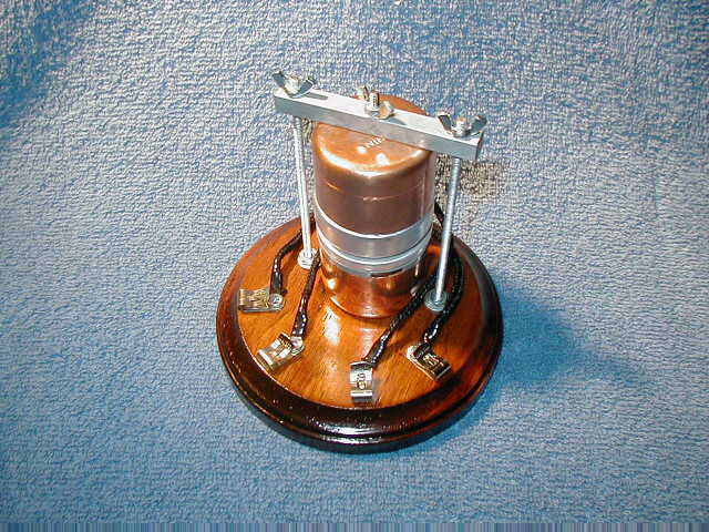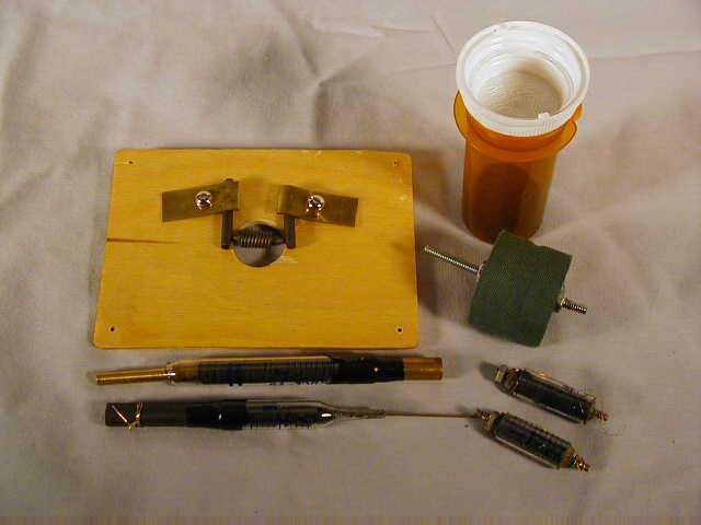 This is the second in a series of thermionic triodes, based on votive glass, that's featured in the book. I call this one the "Tennis Ball" triode because of the overall appearance of the glass globe. Notice the coaxial arrangement of internal electrodes.
