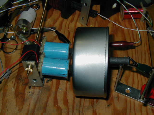 This represents one of my initial attempts at building an electromechanical amplifier, a design that evolved to become the "Balance Beam" amplifier. To your left, you can see a pair of voice coils (harvested from the ringer mechanism of some old desk phones) and a stack of bias magnets removed from some old cabinet catches. The floor of the tin can serves as a diaphragm. To the right, you make out one of the carbon contacts, which was harvested from a flashlight battery.