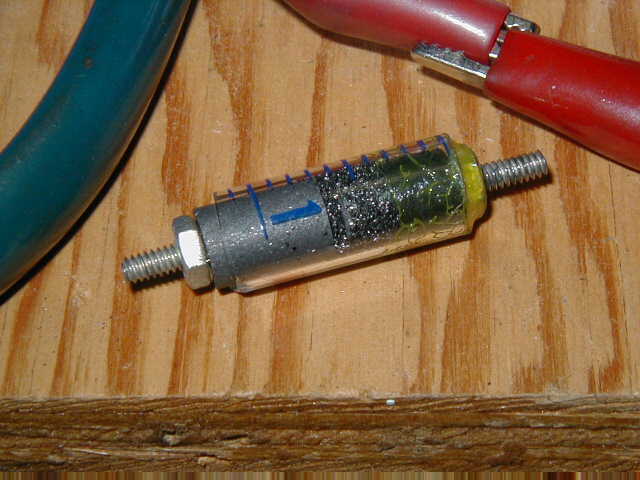 I experimented with several ways to produce vibration-sensitive capsules. This one uses turned carbon cylinders, one fixed and one moveable, fitted to the interior of a section of a glass blood serum tube. The space between the cylinders is filled with polished carbon granules.