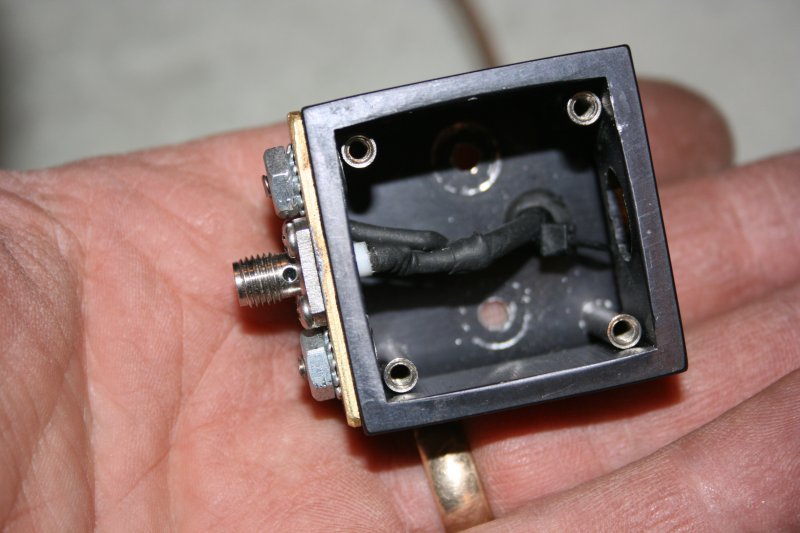 I mounted this antenna box on the side of the pouch. This required drilling holes through the side of the box, through the side of the pouch, and through one of the legs of the frame. I drilled two holes sized to pass 6-32 bolts. A third hole was sized large enough to allow me to thread the coax from the antenna box into the interior of the pouch. Some of these holes are visible in the photo of the frame, described earlier.