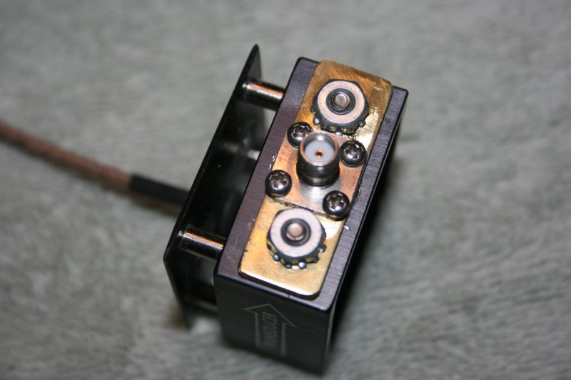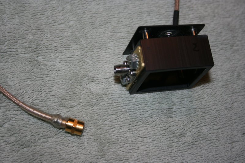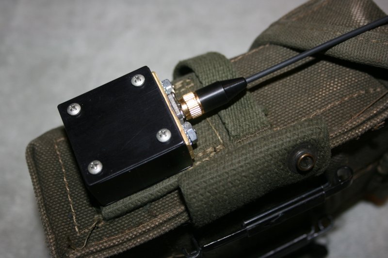 The depth of the frame, (the length of the "legs" on the frame) were sized to meet two criteria. Since the radio will float between the legs of the frame, the legs must be longer than the thickness of the radio so as to protect the radio from being crushed. At the same time, the depth of the frame should be somewhat less than interior space of the pouch, so as to allow clearance for the radio's belt clip. Note that the frame and radio are installed so that, when the pouch is worn, the open side of the frame faces the wearer, with the radio's belt clip facing the opposite direction. The effect is that if the radio is extracted for adjustment, the display will face the operator. The holes visible in the frame will be described in just a moment. Note that some are superfluous, and are the result of exerimentation. An Antenna That Works The dilemma of what to do with a protruding antenna vanished when I realized that the antenna did not have to be attached to the radio! I had purchased a small mag-mount antenna for my car and as I installed it one afternoon, it occurred to me that the same idea-- a separate antenna with its own base, attached to the radio by a length of coax– could be applied to my radio pouch. Digging through my junk box, I located all of the pieces I needed: a small aluminum box, some SMA connectors, and short length of coax. Using small bolts and a bit of brass, I mounted a female SMA connector to the box. I soldered a length of coax to the connector, and then terminated the free end of the coax with a male SMA. The flexible whip antenna, described earlier, threaded onto the connector on the aluminum box. The other end of the coax attached to the radio.