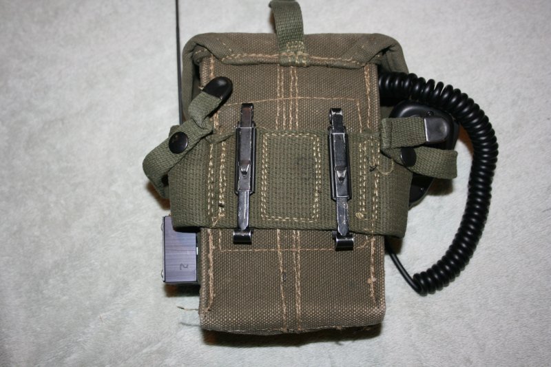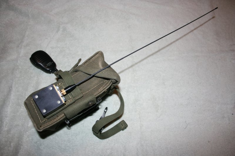 Side and back view of the rig While not hermetically sealed, the pouch still offers significant protection to the radio from sand, dust and possible precipitation, as well as the destructive effects of direct sunlight, which is very intense here in the Southwest. Thus enclosed, I expect the radio to remain free of scratches, dings, and scuff marks. If the radio is dropped, shock is reduced by the energy absorbent characteristics of heavy canvas. The frame prevents accidental key-pressing, and provides enough protection from pressure that under normal circumstances, the radio cannot be damaged. In fact, if the radio was ever struck hard enough to flatten the frame while I was actually wearing it, a broken radio would be the least of my concerns. The combination of the new whip, the antenna box, and the frame seem to provide superior performance with respect to the stock antenna. There is no way for any mechanical forces directed on the antenna to find their way back to the radio. The antenna and antenna box can be damaged, but the radio will remain unscathed.