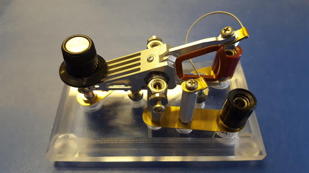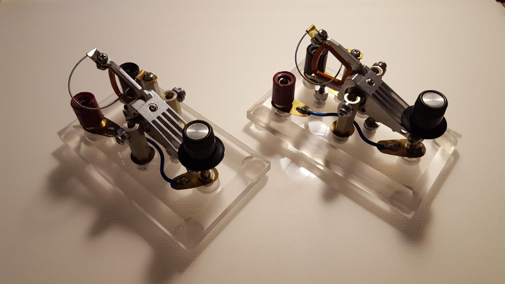 Conclusion The full measure of a Morse key's worth is best determined by an operator with significantly greater skills than I have. That said, I think there are several justifiable (if subjective) comments I could make. For my tastes, this key plays well. Owing to the exceptionally high quality of the bearing, there is no slop or backlash in the motion of the lever. The action is smooth and nearly effortless. The magnets, used in lieu of a return spring in this design, have a nice feel--they generate an appropriate return force but are suitably compliant without feeling mushy. Contact closure is crisp and assertive, without chatter or bounce. Best of all, there is sufficient adjustability baked into this design to account for variety in personal preference. My key may not rank with some high-end Begali, but I judge it to be as good as my J-38, my old Bunnell, and my Russian "spy" key. And I'd happily put it head-to-head against any home-brew key made from kitchen utensils! Finally, it is worth nothing that I have successfully built not one but two keys of this type, which speaks to the reproducibility of the design. The next time one of your hard drives goes south or you see a dead computer sitting on the curb on garbage day, why not consider building your own version of my hard drive Morse key? Figure 16: Meet the Morse key sisters... Virtually identical twins