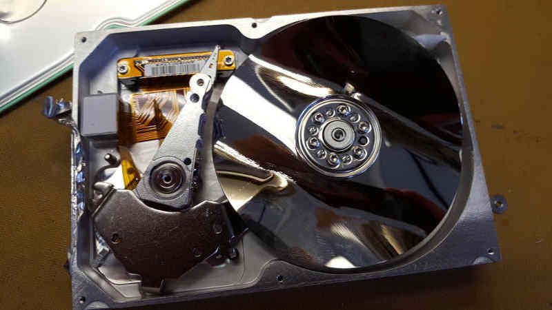 I've personally run into several examples of homemade keys over the years, but it's the Internet that makes studying them a real pleasure. Numerous authors have published photos (with build instructions) of their own creations while others have endeavored to accumulate and maintain large photo galleries of other people's work. Several examples can be found in the list of URLs at the end of this article. Straight keys and paddles have been fabricated from every conceivable kitchen utensil. Keys have been constructed from spoons, forks, butter knives and spatulas. Other favorite "home-brew" materials include metal nail files, hacksaw blades, and clothes pins. Guitar picks, wine corks, upholstery buttons, poker chips, and drawer pulls have been pressed into service as paddles or knobs. Whimsical keys have been fabricated from spark plugs, bulldog clips, cutting boards, office staplers, metal thimbles, and, yes, even Lego (TM). I can't help it—it offends my sensibilities to throw away parts or materials that might prove "perfect" for some as-yet-to-be-identified future project. That's why I often resort to dismantling unwanted electronics and appliances to strip them of their "treasures" before they end up in the trash can. Pieces and parts end up in boxes, coffee cans, and parts bins. The difference between a ham and a hoarder (my wife would argue they are one and same!) is the execution of that next crucial step where collected junk is actually transformed into something new and useful. Recently I came into possession of some decommissioned computer hard drives. I dismantled them (as I've done on many prior occasions) with the intent of extracting the powerful rare-earth magnets inside. Having completed that task, I was about to discard the carcasses when I began to fiddle absentmindedly with one of the drives' actuators. It occurred to me that these might form the basis of a nice home-brew straight key design of my own. After a few hours of contemplation, doodles on scrap paper, and fabrication, the end results have exceeded my expectations. You can see the finished product for yourself in Figure 1. Note that every part of this key, with the exception of the rubber feet (which were purchased at the local hardware store), has been fabricated from salvaged materials, scrap, and trash-can pickings. Interested in building one of your own? There is little to be gained by publishing a "step-by-step" because the whole point of this kind of construction is to make do with what you've got--and it's certain that the junk you've got is not the junk I've got. So instead, I think it best to describe the idea behind this key, its salient features, and why I implemented them the way that I did. This conceptual knowledge (as opposed to a cookbook recipe with parts lists and dimensions) is more likely to be useful in helping you replicate my build. But first, let's take a quick look at a modern hard drive so you can better appreciate what would inspire this project in the first place. A Nickel Tour of Your Computer Hard Drive To those unfamiliar with how they function, one could creatively describe a modern hard drive as the cross between a tape recorder and a phonograph. Like a tape recorder, a hard drive uses a magnetic head to write patterns onto a recording medium. However, instead of magnetic tape, the medium in a hard drive is a rigid disk or platter. The platter, coated with a magnetic compound, is affixed to a rotating spindle that's driven by a motor. An interesting feature of hard drive heads is that they do not actually touch the recording medium while in operation (as tape recorder heads do). Instead they rely upon aerodynamics to glide on a cushion of air a few millionths of an inch above the surface of the platter. Figure 2: Inside a trashed hard drive