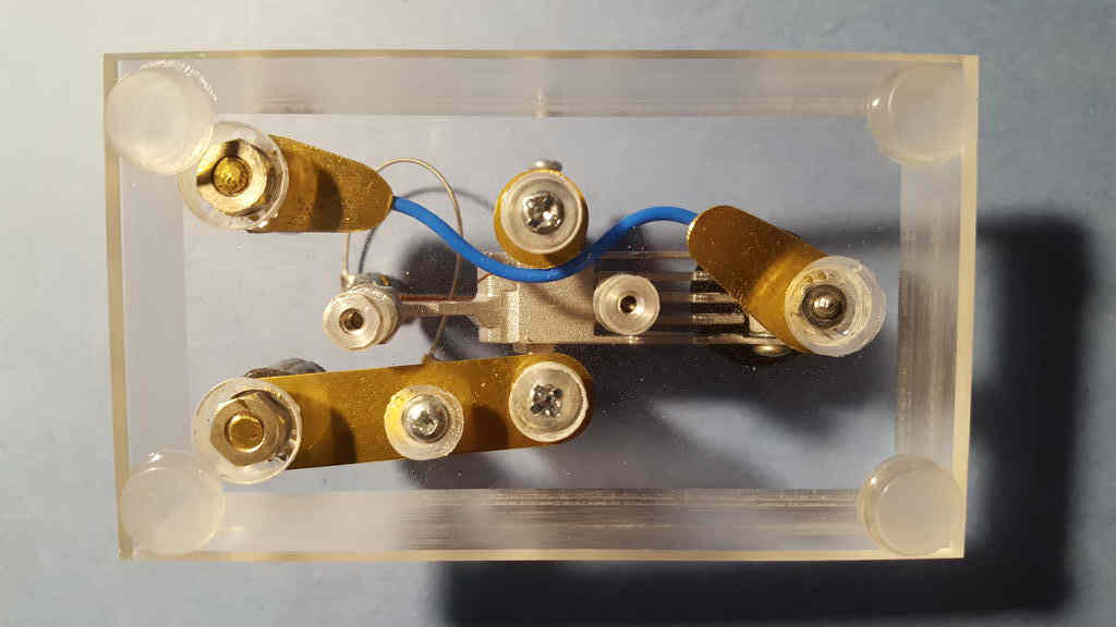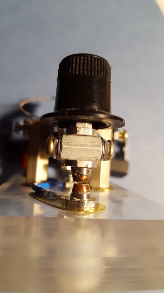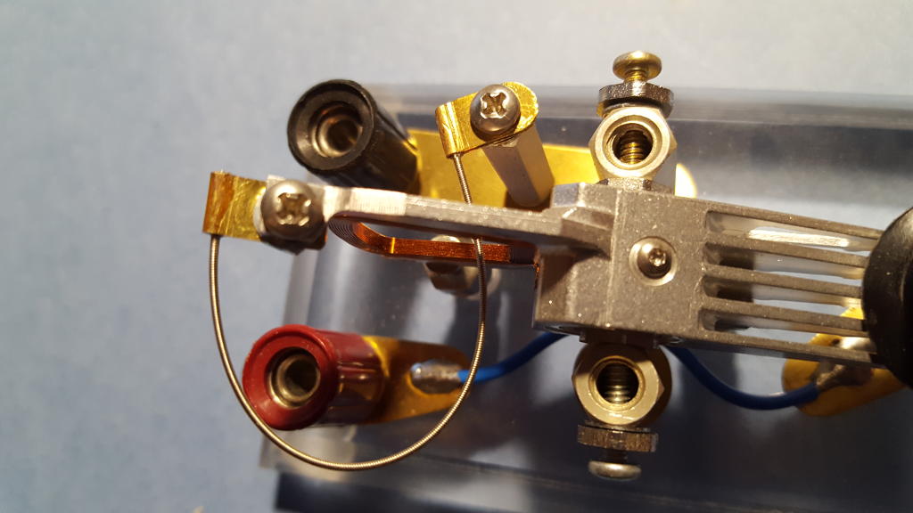 Surprise #2 Conductive pads made from brass shim stock and a short piece of wire were fabricated to carry current in and out of the key. They were terminated at a set of banana jacks at the rear of the key. With the key depressed, I had planned for current to enter the left (red) banana jack, pass through the wire to the lower key contact, from the lower contact to the upper contact in the key lever, through the key lever to the right trunnion, and from the trunnion to the right (black) banana jack. Simple, right? Surprise! It didn't work! With the key depressed, the resistance measured between the banana jacks was more than 1000 ohms! I cobbled together a second key lever from another hard drive actuator and installed it. This time, the closed key didn't show any continuity at all! What the heck was going on? A quick check with my multimeter revealed that the fault lay between the key lever and the trunnion. In other words, current didn't seem to want to flow through the actuator bearing. I had presumed that it would (I have a Japanese straight key where key current is passed through a set of ball bearings in one of the trunnions). So why didn't it work in this case? The truth is I don't know. My guess is that the bearings in a hard drive head actuator are not run-of-the-mill. If the balls in the bearing are not metal but ceramic, for example, or if the balls are metal but the races are ceramic, then there would be no conductive path from the inner to outer race. That left me wondering how I might salvage my key design. In the end, I literally "worked around" the problem by providing a current path that bypasses the bearing entirely. This is evident in Figure 14 as a thin, spring-like wire that appears at the top rear of the key lever. That wire is in fact a piece of "D" string from an electric guitar. It provides a flexible electrical path from the right-hand banana jack directly to the key lever. The guitar string was terminated at each end with little metal tabs fashioned from brass shim stock. The tabs were soldered to the ends of the guitar string. They were then drilled to clear 4-40 screws. One tab was fastened to a preexisting hole in the tail of the key lever using a screw, nut, and lock washer. This can be seen in Figure 15. The guitar string threads through the voice coil at the rear of the key and terminates at the top of hex standoff using a 4-40 screw. The action of the key's movement on the string is torsional and can't amount to more than a degree or two of twist. A tiny influence like that on a material as strong and elastic as music wire will never cause it to wear out or break. Conversely, the effect of the guitar string on the feel of the key lever is undetectable. The good news is this: The closed-contact resistance of the key with the guitar string bypass in place measures a scant few tenths of an ohm--commensurate with the intrinsic resistance of my meter probes themselves. Figure 14: A guitar string corrects the bearing's conductivity problem