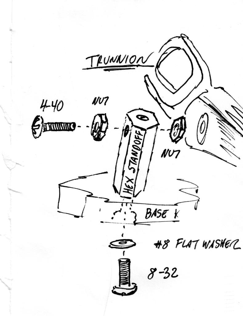 Trunnions The lever of a typical Morse (straight) key has a set of trunnions. What's a trunnion? The word has a military origin and is associated with artillery. If you've ever seen photos of an antique cannon--I'm talking "Civil War" or "Napoleon" here--you've no doubt noticed the two cylindrical horns that project from the sides of the barrel. These are its trunnions. They're used to anchor the cannon to its carriage and to provide a pivot by which the elevation of the gun can be adjusted. Likewise, Morse key trunnions secure the key lever to its base and provide a pivot by which it can be moved up and down. The trunnions of a typical Morse key fit into bearings held by a pair of bearing supports. A hard drive actuator has no trunnions because its bearing resides inside of the actuator itself. The support structure for the lever of my key, then, is sort of the inverse of what you'd normally find. If you refer to the photo in Figure 1 and my "thinking paper" image in Figure 4, you'll see that the supports for the key lever are nothing more than a pair of threaded aluminum hex standoffs. The standoffs are secured to the base with 8-32 screws and #8 flat washers. To provide bearing supports, I drilled crossway through each standoff near the top. A 4-40 screw passes through the support and threads into the bearing in the actuator. A pair of nuts allow the bearing screw to be locked so that use of the key won't cause it to work its way out. .