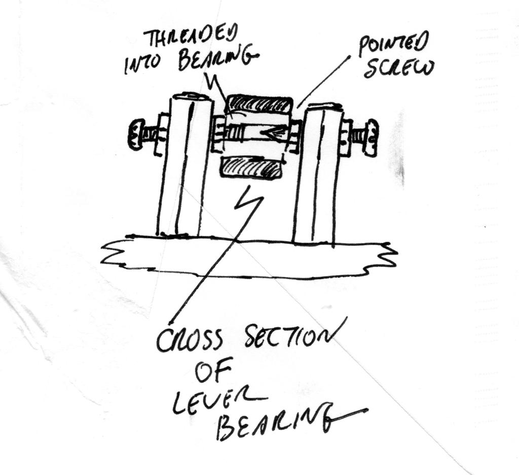 Surprise #1 As simple and straightforward as my trunnion supports seem, this was the point where I experienced the first surprise of this project. Let me explain: When I first conceived of assembling my key, I tested a handful of screws from my junk box to see which would thread successfully into the actuator bearing. A 4-40 screw fit nicely. I naively assumed that the threads at both ends of the bearing would be the same. They were not. In fact, one side was 4-40, the other was a metric thread of some type! You can imagine this created a problem for me. I did not have any metric nuts nor screws of sufficient length. The bore of the bearing was hardened, so it was not practical to drill it out and tap new threads into it. I resolved the problem this way: On the left side of the key, the 4-40 bearing screw threads into the bearing as previously illustrated/described. On the right side of the key, the 4-40 screw was sharpened into an acute point that projects into the metric-threaded hole. Figure 5 illustrates this idea. Between the two trunnion screws, the actuator is held securely, but teeters smoothly on its bearing with no signs of slop or side-to-side play. Figure 5: Dealing with mis-matched mounting holes