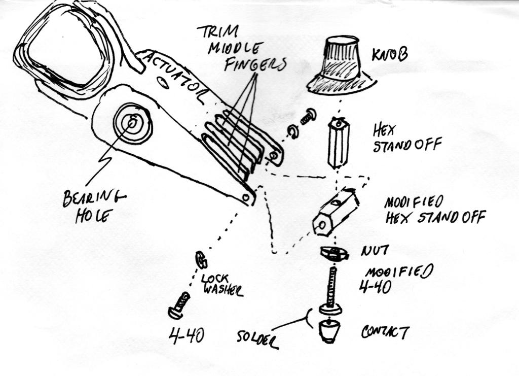 Preparing the Key Lever To serve as a proper Morse key lever, I had to devise some means for attaching a knob to the head-end of the actuator. I also needed to find some way to mount a switch contact. Happily, I found a way to do both with the simple assembly shown in Figure 6. First, I needed to modify the actuator. Mine featured five fingers, complete with read/write heads. I began by carefully pulling off the heads with a pair of needle-nose pliers. Then, using a pair of side-cutters, I shortened the three middle fingers. This allowed me to install a small hex standoff, about 7/16 inch in length, between the remaining (outer) fingers. The standoff was secured with short 4-40 screws and some lock washers. Next, I drilled a hole crossway through the center of the standoff. The contact screw (I'll describe this in greater detail in just a moment) was inserted through the hole from the bottom and secured at the top with another hex standoff. The latter was then inserted (and glued) into the bore of a plastic knob. Additional nuts were fitted, as necessary, to space everything properly. See Figure 7. Figure 6: A plan for modifying the hard drive's head actuator