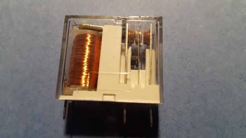 Contacts Ultimately, a Morse key is nothing more than a momentary-contact switch. To close a circuit, all a switch needs to do is to bring two conducting surfaces into contact. Simple... or so it would seem. In fact, designing a reliable, high-quality switch is notoriously difficult. Part of the problem stems from the chemically active nature of most metals. Exposure to air and moisture invariably encourages the growth of oxides, corrosion, and other surface films that can result in poor contact and poor electrical conductivity. Even under the best of circumstances, mechanical switches are subject to chatter and "contact bounce." This is a phenomenon where a single physical closure of a pair of contacts can actually result in a rapid and chaotic series of electrical "makes" and "breaks" before a stable connection is finally achieved. Switch manufacturers, who have researched and understand the physics behind these problems, have gone to great lengths to develop alloys from which superior contacts can be made. So, rather than reinvent the wheel, I chose to defer to their expertise. My contacts were harvested from a discarded relay. See Figure 8. Figure 8: A discarded relay. Note the switch contacts at the upper right