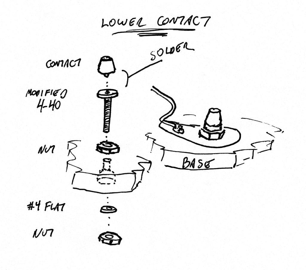 Relay contacts are usually riveted in place, but they can be extracted through the clever application of a drill bit, pliers, or a small chisel. Note that my Morse key requires two such contacts, one of which is attached to the key lever and one which is anchored to the key's base. To make salvaged contacts useful, they need to be attached to a threaded stem. I made my stems from 4-40 screws. The screws were chucked in a hand drill and spun while the heads were dressed with a bastard file. The object here was to eliminate the screw slots and render the head perfectly flat. When the stems were complete, they were each topped with a salvaged contact and then the contacts were soldered to the stems to hold them in place. See Figure 9. Needless to say, the completed lower contact is mounted in the base of the key and positioned directly beneath the upper contact in the key lever. See Figure 10. Figure 9: Plan for a contact assembly and the installation of a contact assembly into the base