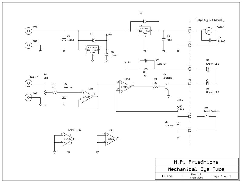 The Circuit My prototype display consists of two green LEDs, mounted to a rotating disk. For the time being, I'll ask that you disregard the matter of how power is actually delivered through the rotating parts. I'll address that in more detail, shortly. The display disk is attached to a shaft, and that shaft is driven by a small D.C. motor. Since display behavior is dependent on timing, I used an LM7805 (U2) to regulate the voltage feeding the motor. Another LM7805 (U1) is used to regulate power for the rest of the circuitry. Timing signals are generated with the 1-microfarad capacitor, C6. C6 is charged from the 5-volt supply rail through timing resistor R5. Mounted on the rotating shaft of the display is small magnet which is oriented to whirl past the face of a glass reed switch. Once every revolution of the display disk, the reed switch is closed, and C6 is shorted to ground. This resets it to zero volts, after which it begins to charge up again. If you probe the junction between R5 and C6 with an oscilloscope as the apparatus is running, you will find a signal that looks more or less like a saw tooth. The mechanical magic eye schematic. Click on this image to enlarge it