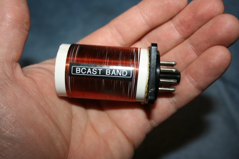 Ideally, T1 should be an audio output transformer that correctly matches the output impedance of the 1T4 tube to the high-impedance headphones I am using. Small vacuum tube audio output transformers are difficult to come by these days, and in any event, I preferred to make due with something in my junk box... after all, that was the whole point of this exercise. There, I discovered a small 115 volt to 12 volt power transformer. I connected the 115 volt primary of the transformer to L3 and the "B" supply, and connected the 12 volt secondary to the headphone binding posts. The presence of the transformer in the headphone circuit not only eliminates the potential for the accident I described a moment ago, it also eliminates all direct current in the headphones. This is a good thing when working with vintage headphones, as it protects them against accidental demagnetization. Granted, using a power transformer as an audio output transformer is crude, and the electrical match is poor, but I was not able to detect any significant reduction in output volume. Miscellaneous Parts The Pipsqueak contains a handful of capacitors, resistors, and other parts of various types and values. None of these are critical in nature, and all them were carefully removed from electronic junk that others had discarded. Substitution with similar parts with ballpark values is not likely to have significant impact on the functionality of the radio. A Tuning Coil For the AM Broadcast Band Years ago, radio part manufacturers sold tuning coils that were wound on plastic or bakelite forms. These forms were fitted with metal pins, not unlike a vacuum tube, which allowed the coils to be plugged into sockets. When used in conjunction with the recommended variable capacitor, one of these standard coils could be used to build a radio that tuned across a specific portion of the radio spectrum. Being socketed, it was a simple matter to unplug the coil and replace it with a different type, to allow receiver "coverage" of frequencies not reachable with the first coil. Manufacturers even sold empty or blank coil forms, which allowed experimenters to wind and create their own coils.