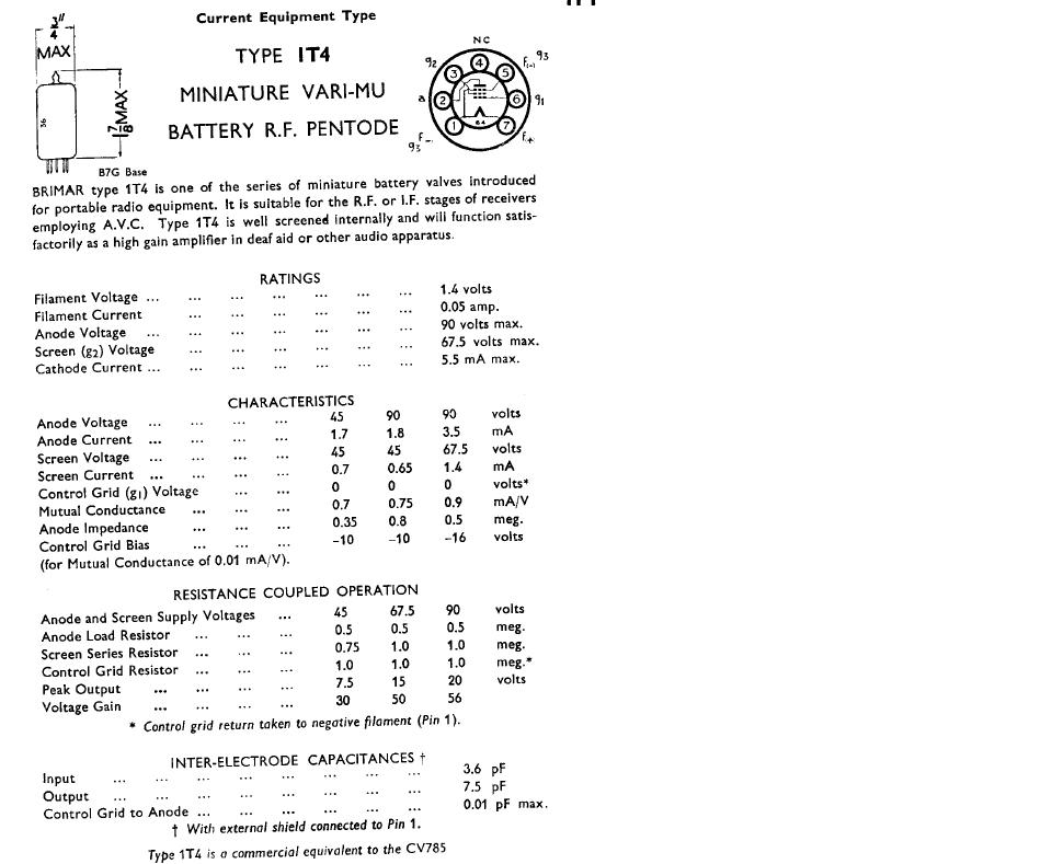 Connections are made to the Pipsqueak through binding posts, which are mounted through holes drilled in the aluminum chassis. These posts were all salvaged from discarded electrical equipment. Two binding posts at the front of the radio allow for the connection of headphones. Three pairs of binding posts at the rear of the radio allow for the connection of the "A" battery, the "B" battery, and an antenna and ground. The Vacuum Tube The 1T4 tube was a gift from a friend, but this tube, and similar battery-operated tubes, can be located and ordered through vendors on the Internet. The tube socket was used, and salvaged from discarded equipment. Electrical characteristics for this tube can be found here and here. The Variable Capacitor The tuning capacitor is new-old-stock, and was purchased through an online auction site for a few dollars. Similar parts show up with regularity. Other sources include hamfests, or suppliers of vintage radio parts. Thrift store, Salvation Army, or garbage-can stereos are a source of similar components. I really like the capacitor I used because it includes some gearing, which reduces the rate at which the capacitor blades move. This makes tuning much less "touchy." It was originally designed for printed circuit board mounting, as evidenced by four post-like feet, clearly intended to be soldered into holes in a printed circuit board. I found that with a little force, I could screw a short, threaded, standoff onto each post, which not only extended the feet but gave me a way to bolt the capacitor to the chassis. To assure that the capacitor's feet would never pull out of the standoffs, I applied a few drops of epoxy before forcing them together.