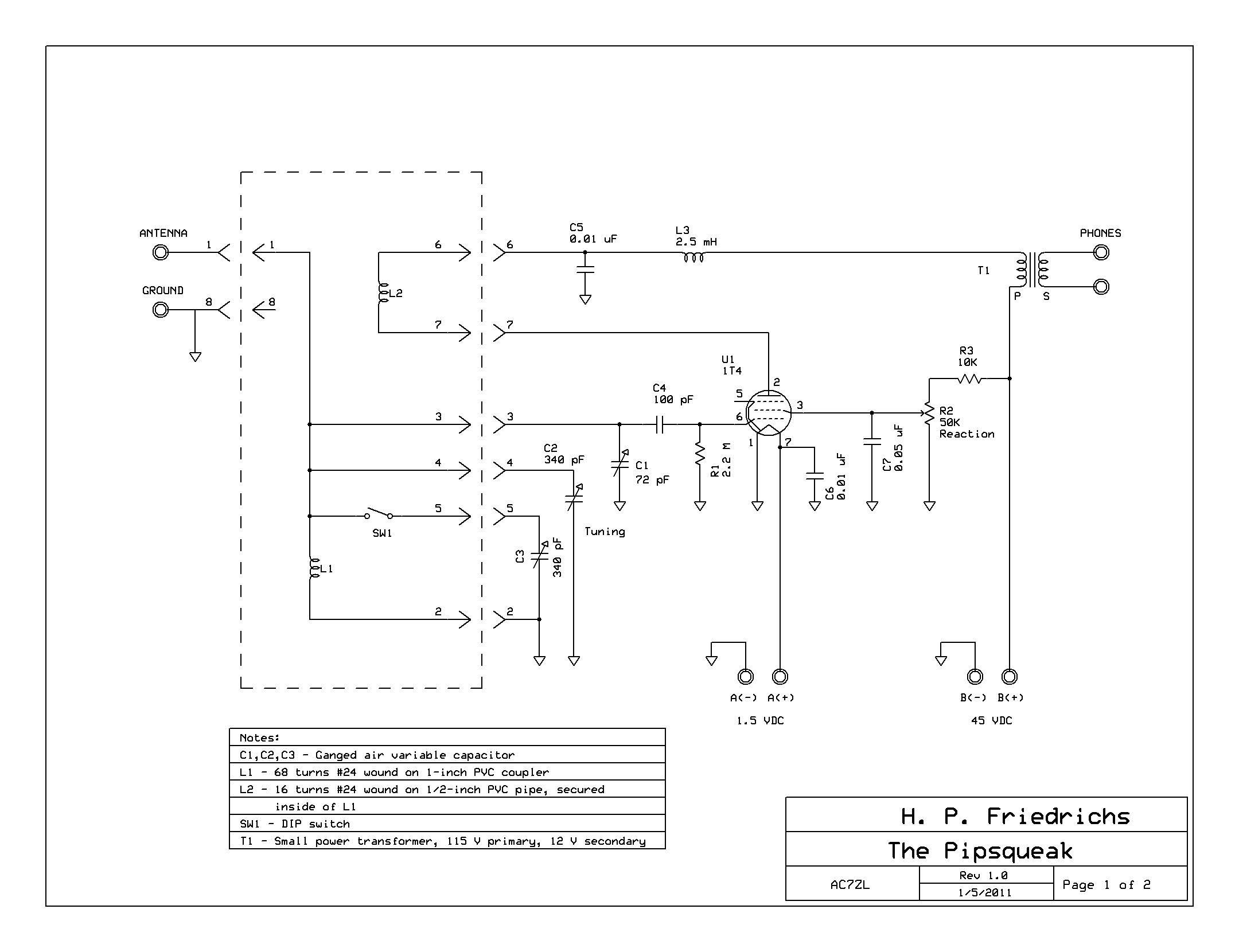 Radio RoomBuilding the "Pipsqueak" ReceiverIntroduction One fall evening about ten years ago, I was inspired to tinker with some old radio parts I had accumulated in a box. I found a ten or twelve-inch-square slab of plywood lying about, and using some wood screws, I secured to its surface a tube socket and a couple of old variable capacitors. A row of screws, partially driven into the wood, served as battery and phone terminals. I wound tuning and reaction coils on a chunk of cardboard mailing tube, and then used a fistful of alligator leads to wire everything up. The circuit was of the classic regenerative type, and wiring this receiver took all of two minutes. The radio was grounded to the cover screw of a nearby wall outlet, and the antenna was nothing more than a fifteen or twenty-foot length of wire which had been thumb-tacked to the ceiling of the garage. I inserted a #27 triode into the tube socket, and hooked up a set of batteries The headphones screeched. I fiddled with the controls, and my phones suddenly filled with strange music and dialog about... vampires! Puzzled, I waited for station identification and discovered that I had been listening to a radio broadcast of Bram Stoker's Dracula, broadcast from a BBC station, more than 5000 miles away. If that isn't magic, nothing is. It's entirely fair to say that there is no radio circuit, using so few components, that can outperform a regenerative receiver in terms of sensitivity and selectivity. Regenerative receivers are simple and fun to build. Building Something From Nothing There is a certain pack-rat behavior associated with many engineers and ham radio folks, and I readily admit my guilt in this regard. Most of us have well-developed junk-boxes. However, my own propensity to collect junk has nothing to do accumulation for the sake of accumulation. Rather, I would argue, my eyes see potential in things others are willing to discard. It bothers me to see a resource go into a landfill when I know I could make something useful out of it. In my world, no stereo, computer, television, or appliance, for example, should end up in a garbage can until it has been inspected for and stripped of its bounty of useful pieces and parts. There is little point to this activity if the material thus collected is not eventually put to good use. In this article, I describe a project I call the "Pipsqueak" radio, a simple regenerative receiving set fabricated from some of the odds and ends I have collected over time.