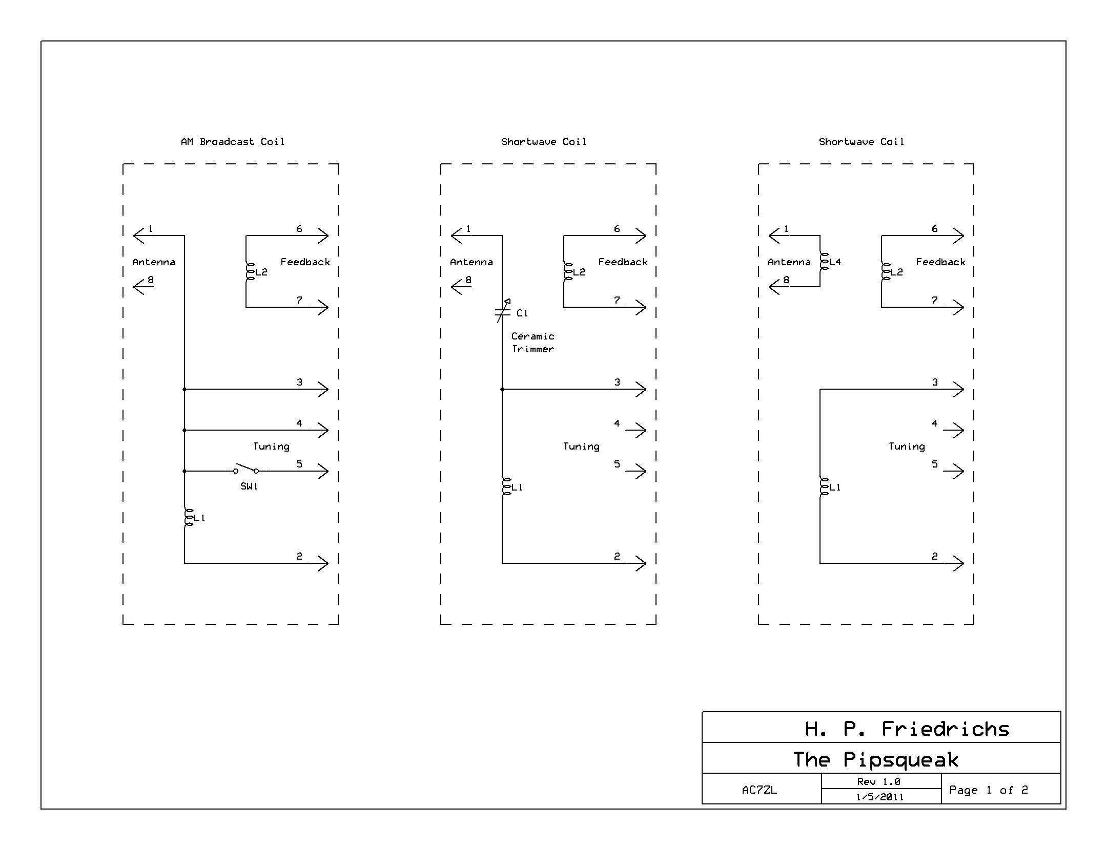 How The Pipsqueak Works The schematic diagram for the Pipsqueak can be found here. Radio signals are directed from the antenna to a tuning circuit composed of the coil L1 and capacitors C1, C2 and C3. The combination of these parts comprise the Pipsqueak's tuner. C1, C2, and C3 are adjustable and are all attached to the same shaft. As the tuner shaft is adjusted, the values of C1, C2, and C3 change. This changes the resonant frequency of the tuner, that is to say, the frequency at which the Pipsqueak will "listen." The Pipsqueak schematic. Click on the image for better resolution.